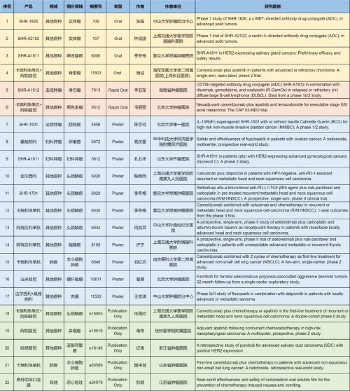 在肺癌、妇科肿瘤、淋巴瘤、膀胱癌、头颈肿瘤、黑色素瘤、肉瘤、鼻咽癌、脊索瘤、唾液腺癌、胸腺癌、硬纤维瘤、涎腺导管癌等其他多个疾病领域,卡瑞利珠单抗、阿帕替尼、阿得贝利单抗、吡咯替尼、达尔西利、氟唑帕利、法米替尼、SHR-1501、瑞拉芙普-α(SHR-1701)、SHR-1826、瑞康曲妥珠单抗(SHR-A1811)、SHR-A1912、SHR-A2102等抗肿瘤创新药相关研究一共入选了4项口头报告、2项快速口头报告、11项壁报展示和4项线上发表,彰显了AG百家乐医药强劲的研发实力。此外,昂丹司琼口溶膜在防治化疗导致的恶心呕吐方面展现出了良好的疗效,本次ASCO年会有1项研究线上发表。